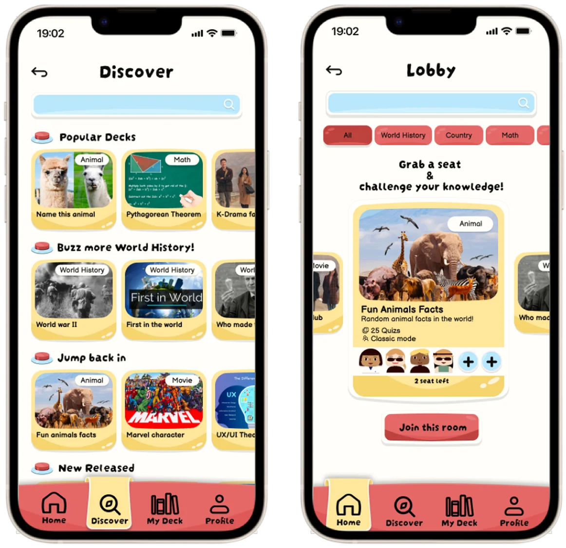 Users can learn random knowledge by discovering pre-made decks within Hit the Buzzer! and challenging with specific players or random matchmaking options.